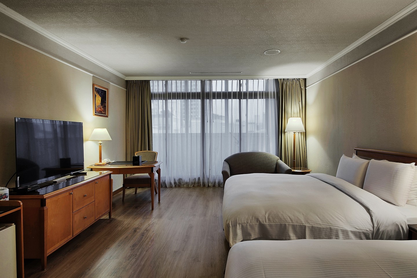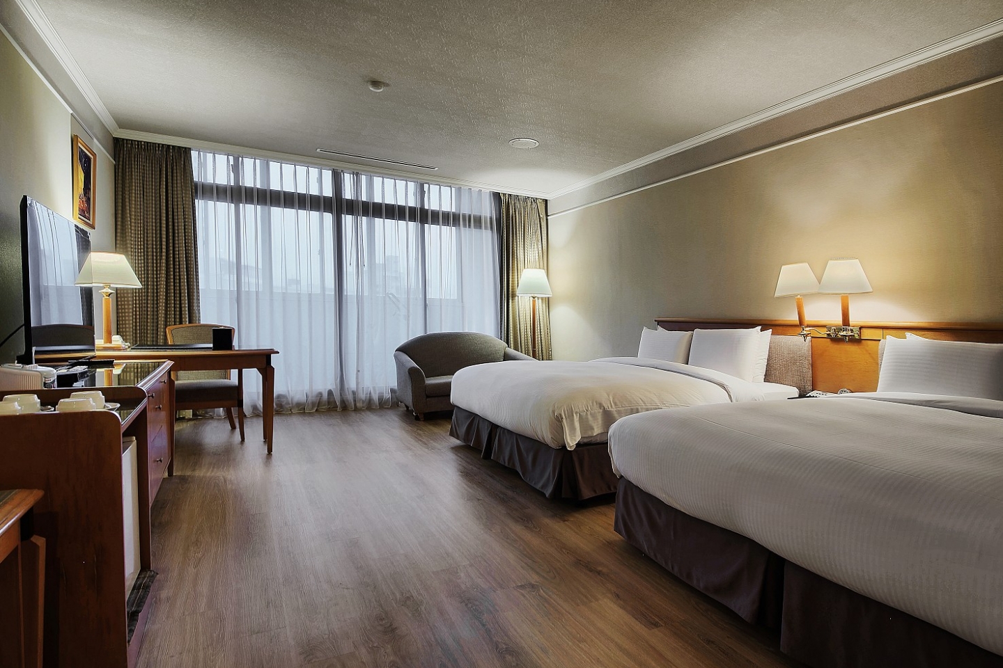 客室にはダブルベッド2台(160×200cm)、液晶テレビ、バスタブとシャワーブースが独立したバスルーム、温水洗浄トイレを備えてお... +